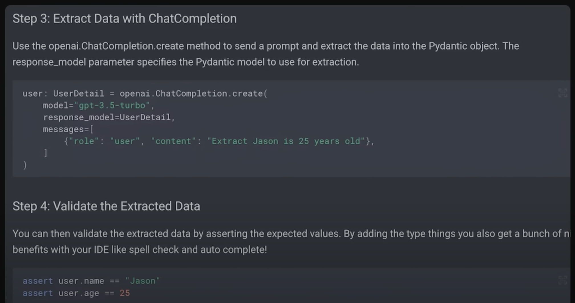 However in this video, Jason Liu lays out a compelling case why Pydantic is the magic glue that allows LLMs to fit inside of software workflows and not randomly break things (much). He lays out a workflow where LLMs return data into Pydantic validator and that helps ensure that the results end up properly parsed and formatted.